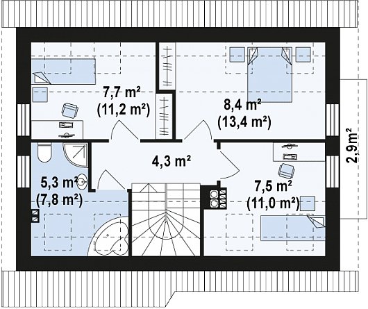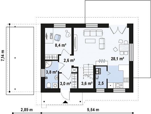 Экономичный в строительстве и реализации дом из СИП с удобной планировкой, с навесом для автомобиля.